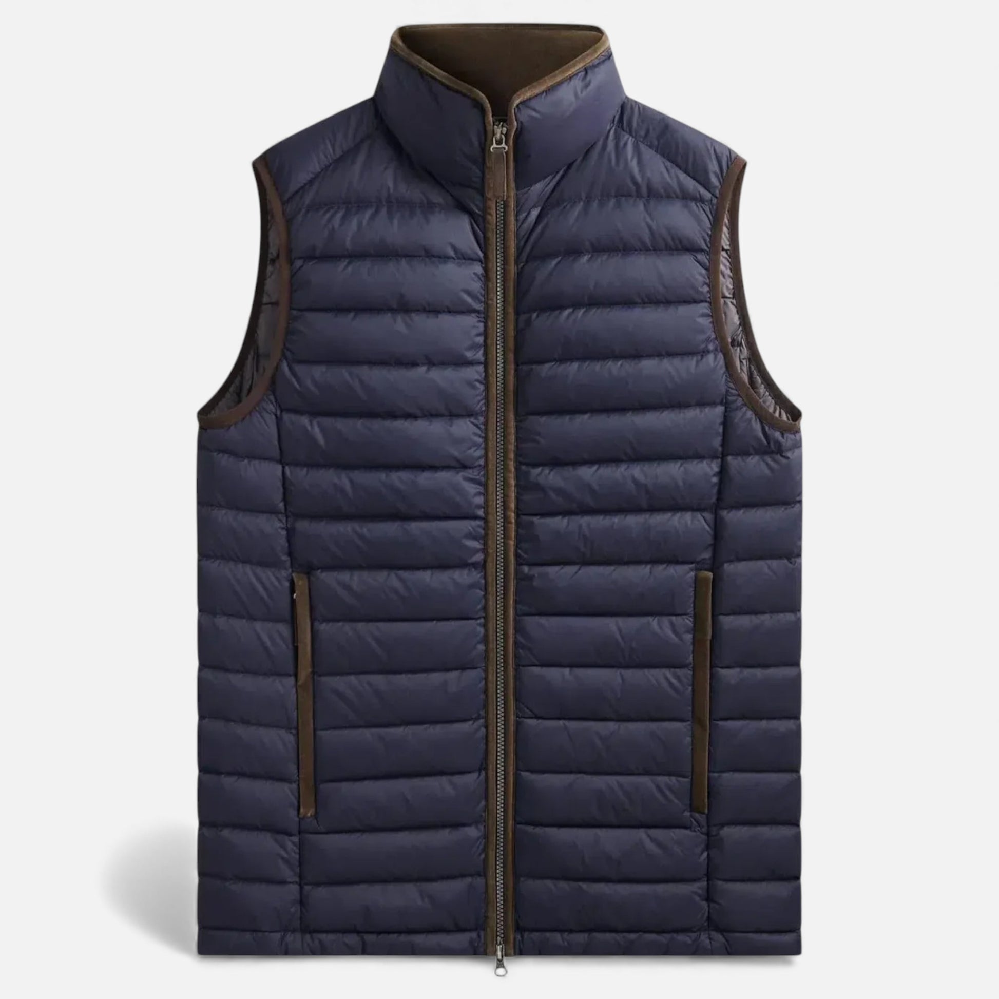 The Eston House Heritage Quilted Gilet brings timeless sophistication to your outerwear collection. Your wardrobe gains a refined, sleeveless layering piece that exudes elegance without overpowering — ideal for crisp mornings or smart‑casual weekends. The deep navy hue and contrasting trim evoke an Ivy League charm, subtly elevating both countryside walks and city strolls.